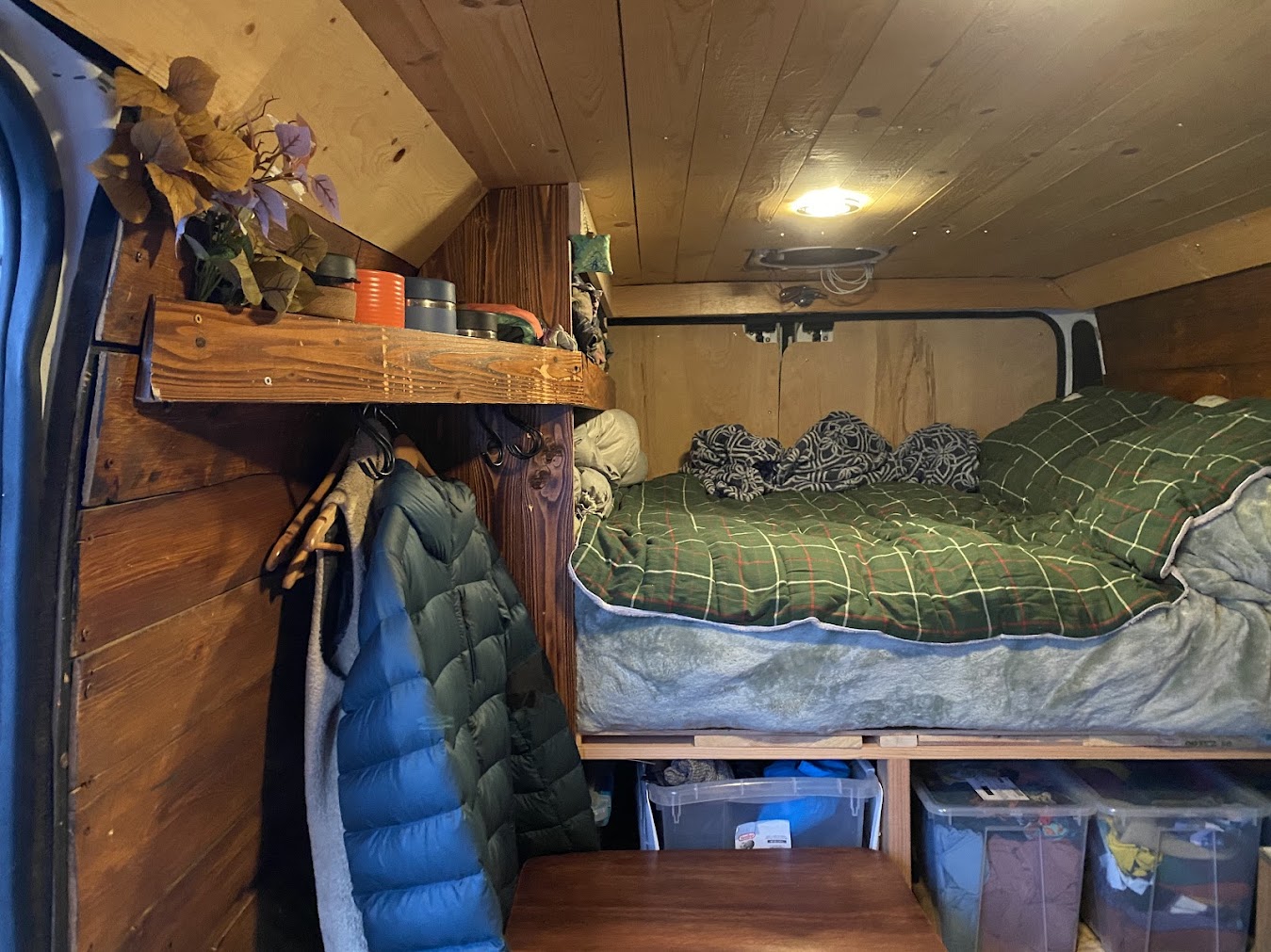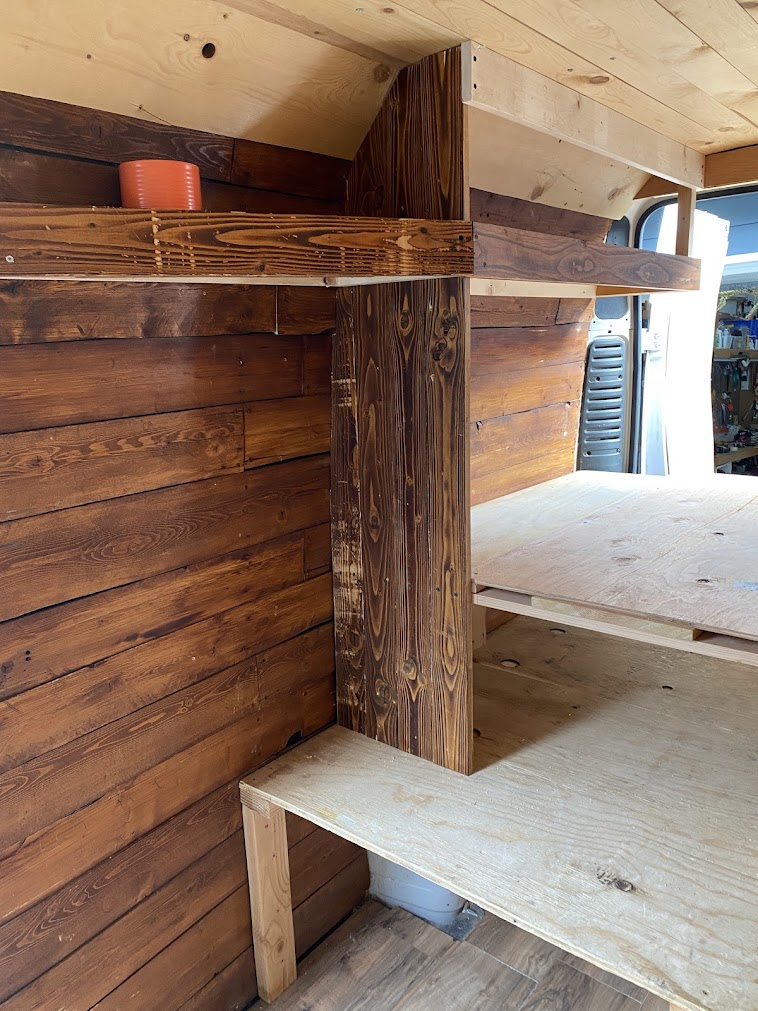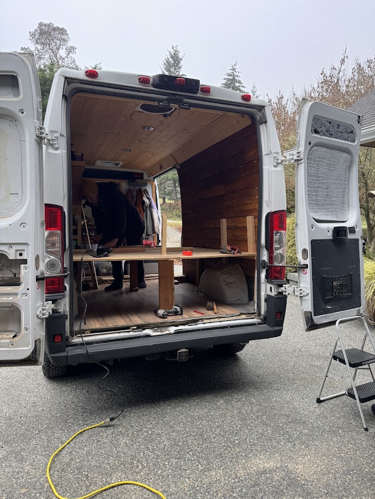 We brought the van to family friends’ and remodeled the back half of the van! We changed the bed platform and shelving to allow for a longer bed and a seating area with a table. We also insulated the back doors and finished them off with plywood paneling to get ready for the winter. Next stop, Canmore, Canada!