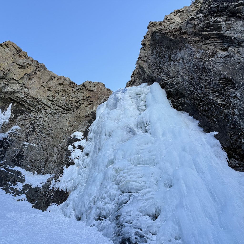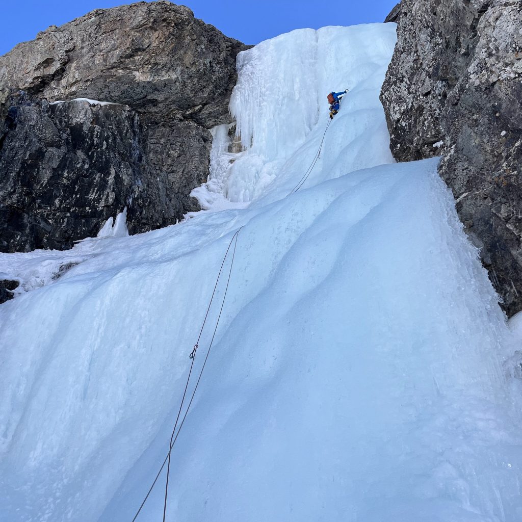 I spent most of January preparing for the ice instructor course – increasing my personal fitness, my confidence leading ice, and familiarity with local routes that were likely to be climbed on the course. All my preparation came together perfectly for the course culminating in some really confidence-boosting climbs the week before the course. I got to top-rope M6 Corner, a mixed climb that helped me feel way more confident on the thin ice and rock when I led Talisman Simulator on the course. I also led Choppos Chimney in my preparation, which was one of the longer and more sustained flows that I had led at the time. It finished in a narrow chimney with a section of thinner ice that required delicate movements.