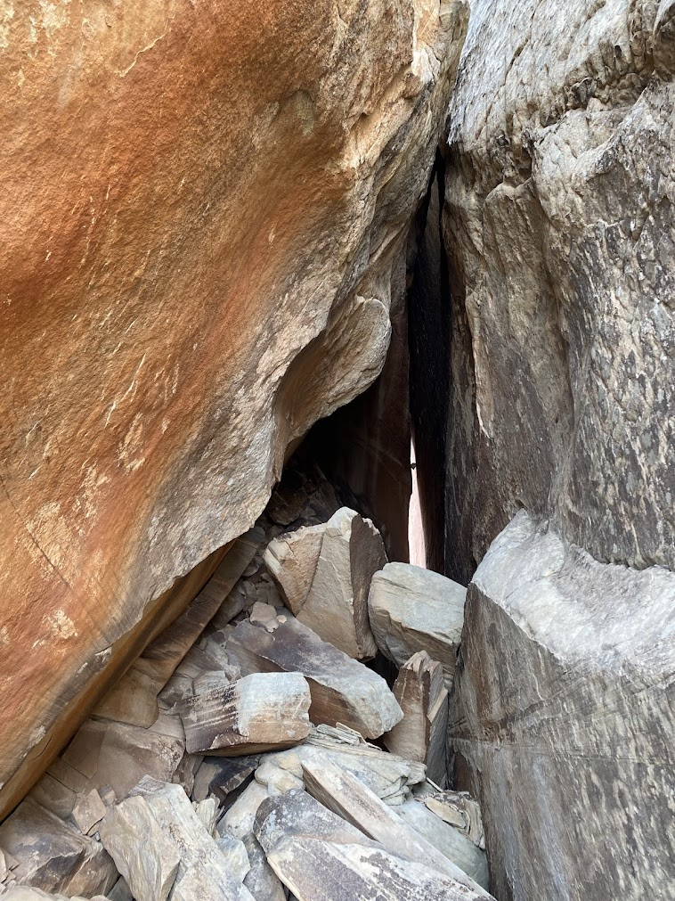 The approach was full-on. We had to scramble carefully on loose blocks and go under this huge chockstone (I think my post-college studio apartment was smaller than this chockstone).