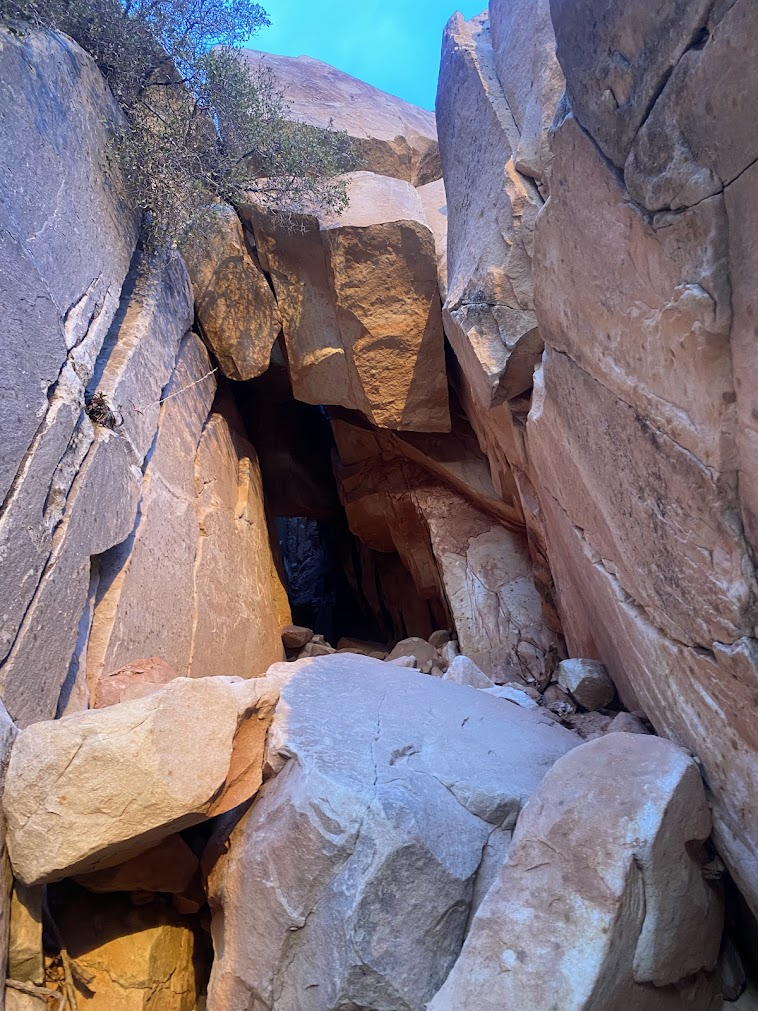 We weren’t sure exactly what we were looking for, but I led up this roughly 5.4 scramble pitch, thinking that when I’d get to the top, I’d see something obvious. Ken was hesitant and warned me to not climb anything I didn’t want to downclimb. I brushed this aside, confident this was definitely the way to go. I scrambled to the top, looked around, and immediately felt frustration and some underlying panic. Where the heck do you go? I looked to the left, and saw a distant gap in the rocks, with light shining through, but definitely not big enough to fit through, and to the right, it cliffed out.