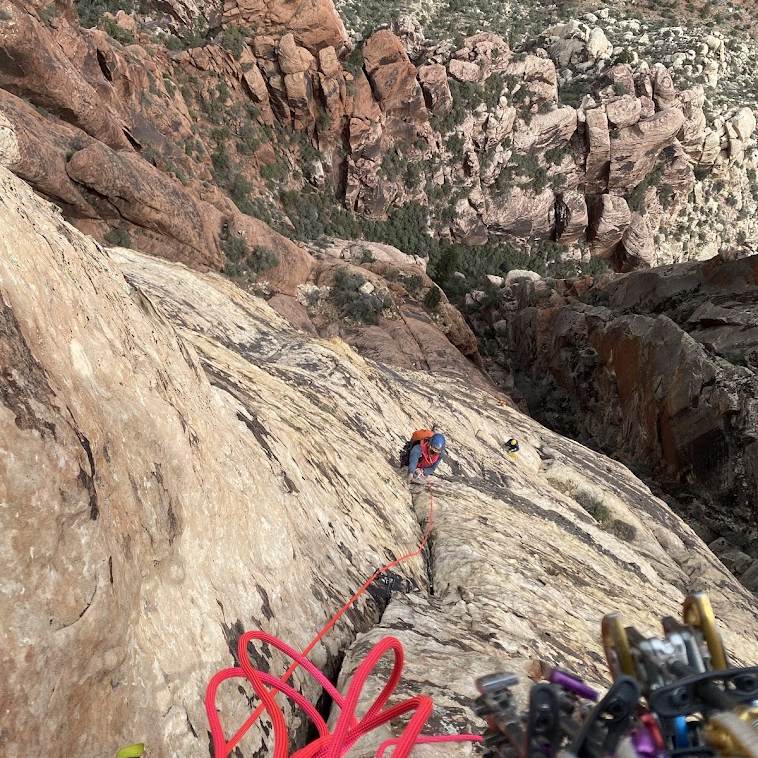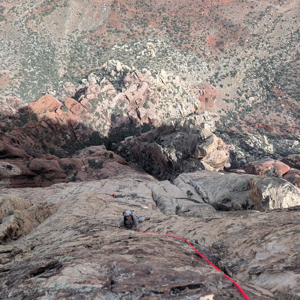 Climbing higher on the route had some incredible exposure. Some 1500 feet looking all the way down the route to the ground, views of the neighboring mountains, and all the way out to the Las Vegas strip.