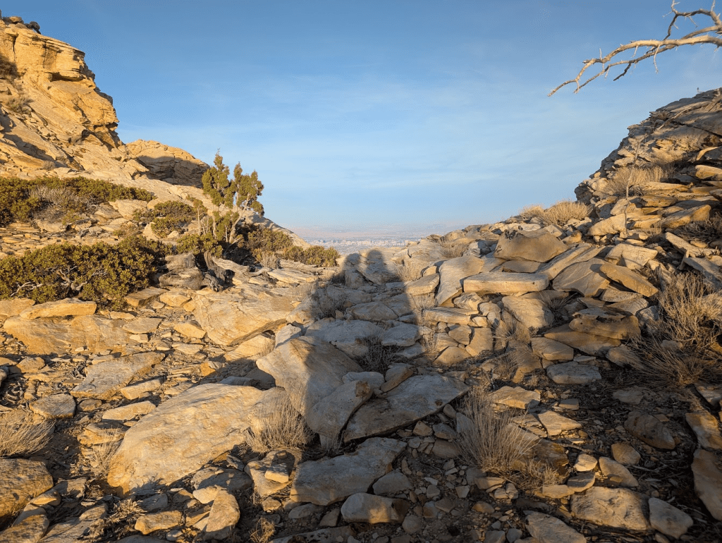 We opted to hike out past Solar Slab, to the Middle Oak Creek trailhead, since this trail is straight, and less rocky than the road coming in from the South Oak Creek trailhead. Then, we had to walk awhile on the highway. Not sure if this was faster in the end, but it was mentally easier to just walk fast on flat ground. We’ll consider just parking here for a future approach to the Aeolian wall.