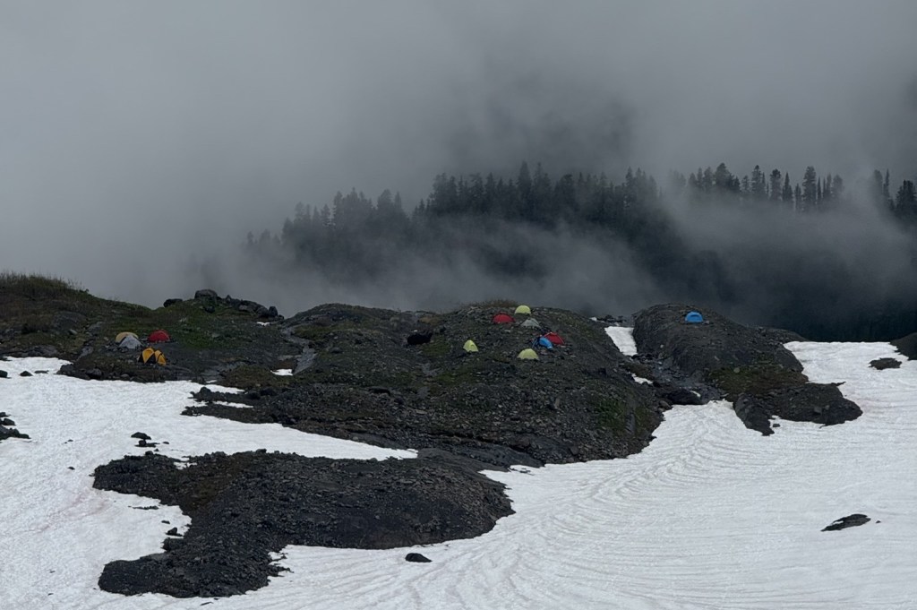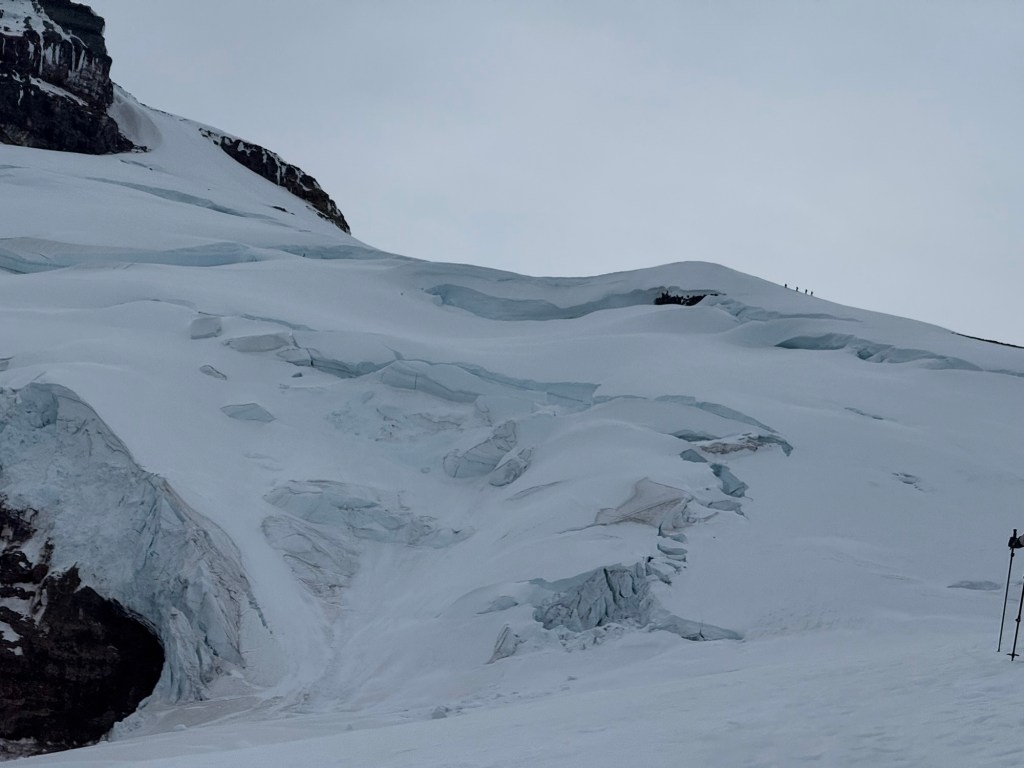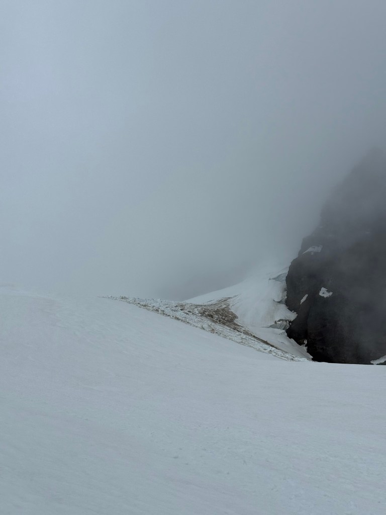 Earlier today, at 11am, our teams just barely made it to the summit, stretching our time plan to the max. The Roman wall on the way up was hard and icy, and we decide it’s worth a slightly longer day to wait for the snow to soften, to have a safer way down. We just had enough visibility for summit selfies with a recognizable background for them to show off to their friends and family, and then we are descending into a cloud, whiteout with visibility as little as 20 feet in front of us, clearing occasionally to see a rock feature below and help us zig zag around. I pulled out my phone multiple times for peace of mind as I confirm our little blue dot location is right on the GPX track we made this morning coming up.