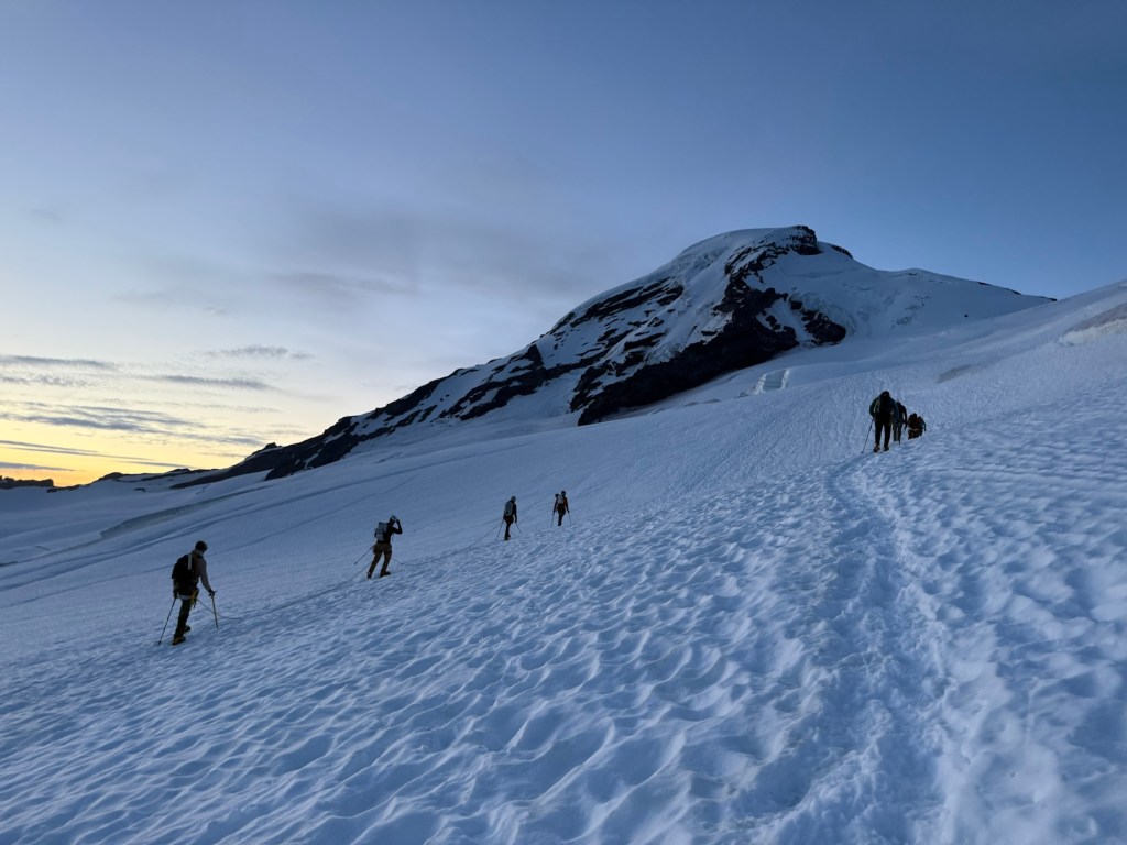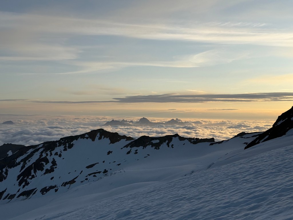 Today, I spent the better part of 13 hours 1-on-1 guiding and coaching a woman up Mount Baker’s Coleman-Deming route. During all this time together, half of which was spent 3 feet apart while I short-roped her on the upper mountain, we discussed all sorts of things, notably what her three children (8, 5, and 3) thought of her leaving for a week to take an Introduction to Mountaineering course halfway across the country. “Don’t die” her eldest told her. She said her 5-year-old is missing her terribly, and her 3-year-old doesn’t yet have a conceptual understanding of what her Mom is doing out here. Surely, I told her, at least the eldest two will be proud to hear of her perseverance and mental and physical strength to keep pushing up to summit Mount baker: 9 hours from low camp to summit.